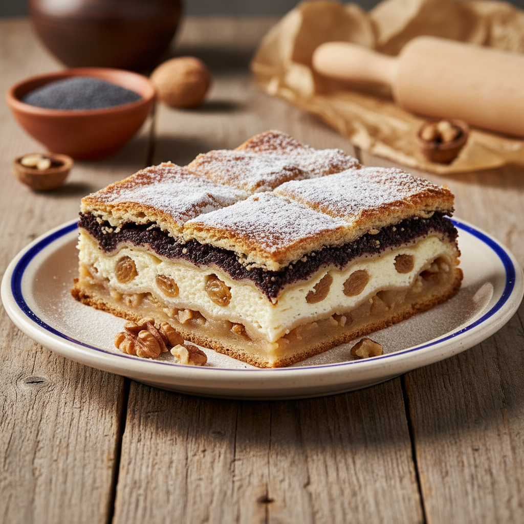 - Ponovitev: Celoten postopek (mak, skuta, orehi, jabolka) ponovite še enkrat v enakem vrstnem redu. Med vsako plastjo nadeva mora biti plast vlečenega testa, premazanega z maslom ali smetanovim prelivom.