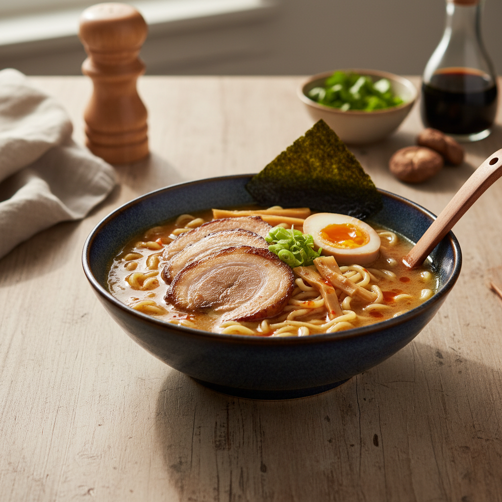 - Začimbna mešanica (Tare): To je srce okusa. Tare je koncentrirana omaka, ki se doda na dno sklede preden se vlije juha. Določa, ali bo ramen slan (shio), sojin (shoyu) ali na osnovi fermentirane sojine paste (miso).