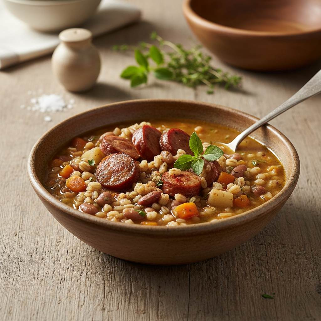 To izbrano meso med dolgim in počasnim vrenjem izloči svojo neponovljivo aromo neposredno v tekočino, ki nato radodarno prepoji vsako zrno ječmena in fižola ter se zažre globoko v vsak košček zelenjave. Nekateri stari mojstri tradicionalne slovenske kmečke kuhinje svetujejo dragocen trik: če je vaše prekajeno meso izjemno slano ali ima premočen vonj po dimu, ga predhodno na hitro prevrite v ločeni posodi z vodo in to vodo zavrzite. Klobaso pa je najbolj pametno in priporočljivo dodati v glavni lonec šele v zadnji tretjini celotnega procesa kuhanja. Na ta inteligenten način bo mesnina odlično ohranila svojo naravno sočnost, obdržala trdno in čvrsto obliko, njen dimljen okus pa bo kljub krajšemu kuhanju še vedno dovolj močno in elegantno prežel celotno jed. Prekuhana klobasa namreč pogosto poči, se izsuši in izgubi bistvo svojega okusa.