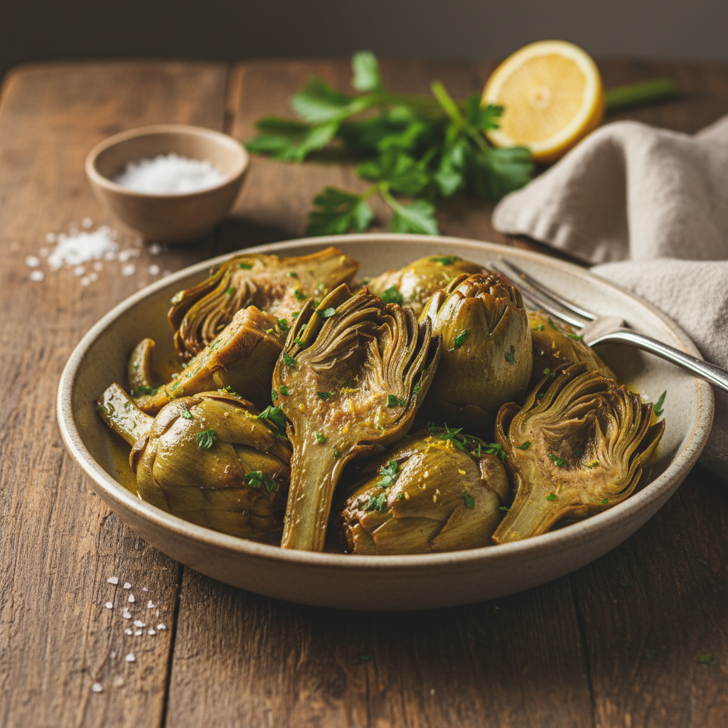 Ta metoda priprave, ki spominja na “alla romana” stil, zagotavlja, da bodo artičoke sočne in polne okusa, saj se kuhajo v lastnem soku in emulziji olja ter vina.
