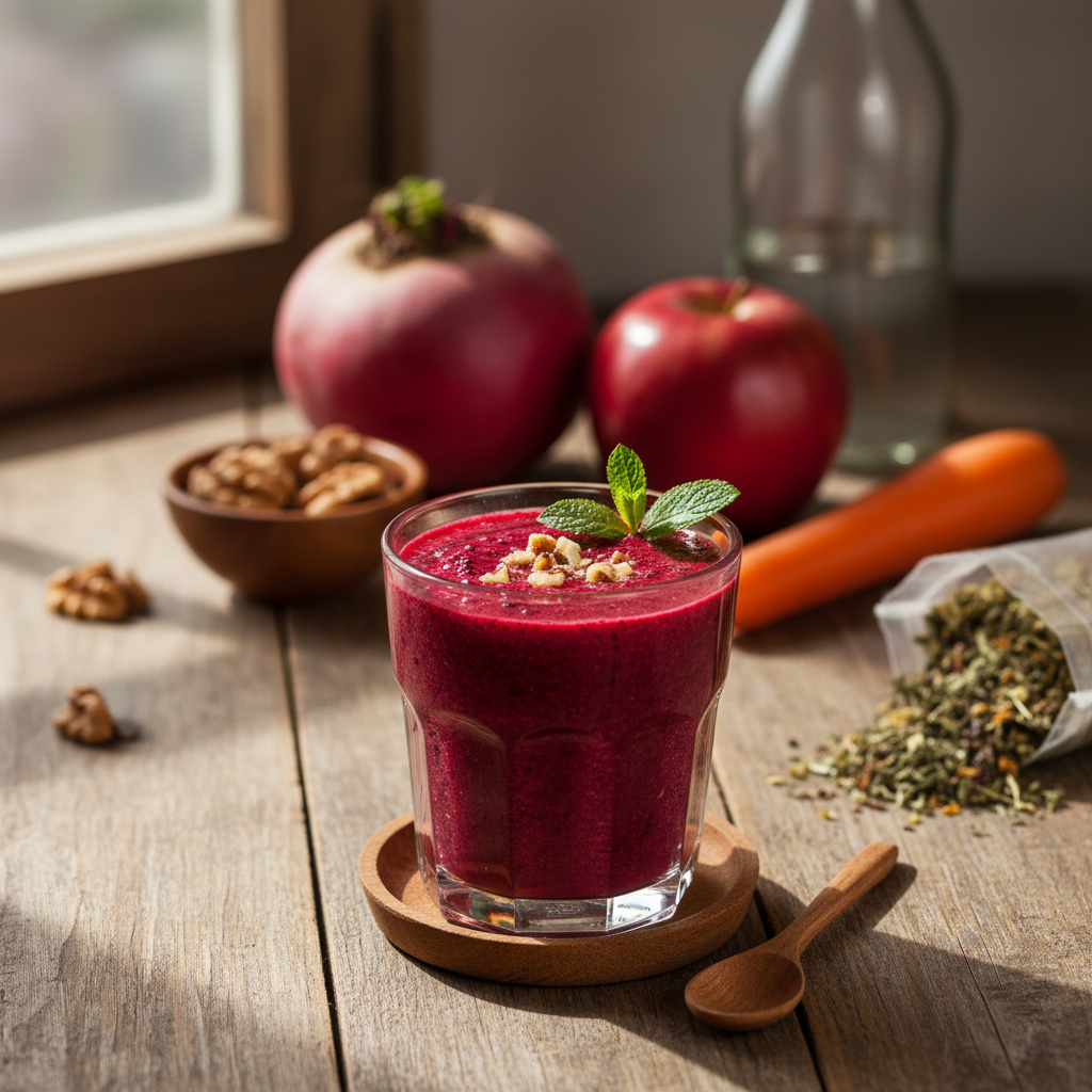 Vsaka sestavina v receptu ima svoje posebne lastnosti, zato je kombinacija še posebej uravnotežena. Surova rdeča pesa vsebuje naravne pigmente in vlaknine, jabolka prinašajo vitamine in antioksidante, korenje pa beta karoten. Oreščki so vir zdravih maščob, ki telesu omogočajo boljšo absorpcijo hranil. Ta kombinacija tako nudi bogato paleto hranil, ki dopolnjujejo običajno prehrano.